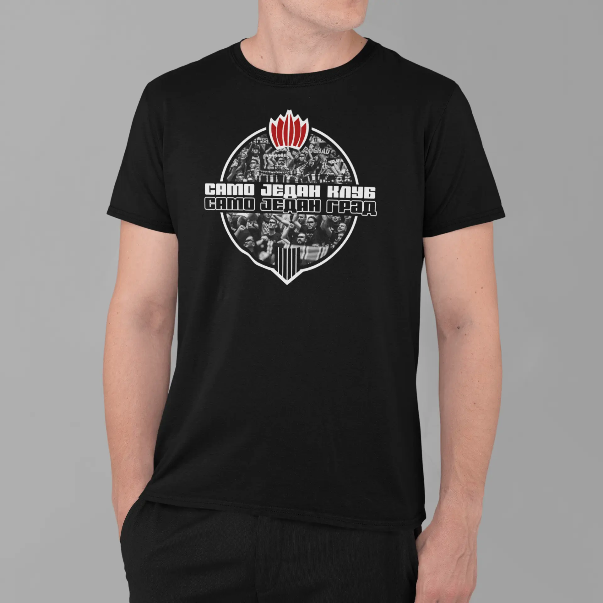 Na majici je prikazan inspirativan print navijača Partizana, koji simbolizuje zajedništvo i strast koju dele prema klubu. Uz sliku, natpis “Samo jedan klub, samo jedan grad” snažno odjekuje, ističući neupitnu posvećenost i odanost Partizanu, koji za mnoge predstavlja više od sportskog tima – to je deo identiteta i kulture grada.